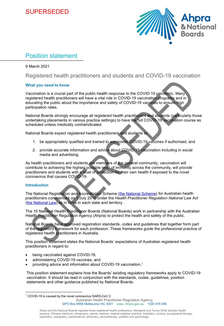 Here is the directive to all health professionals issued on 9 March 2021 that has now been superseded on 21 December 2023, whilst all Australians were on their Christmas holiday. AHPRA have also removed the relevant links to this document from the AHPRA website in this article written about this change of policy by Rebekah Barnett on Dystopian Down Under – Australian Medical Regulator Finally Relaxes COVID Gag Order on Doctors.