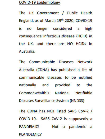 By 19 March 2020 the UK government / Public Health England had downgraded this virus to a disease that was no longer considered to be a high consequence infectious disease (HCID). In Australia there are no HCID’s listed on the national notifiable disease list. That is, the SARSCov2 virus that is stated to be a ‘global pandemic’ is not listed on Australia’s National Notifiable Diseases Surveillance System (NNDSS).