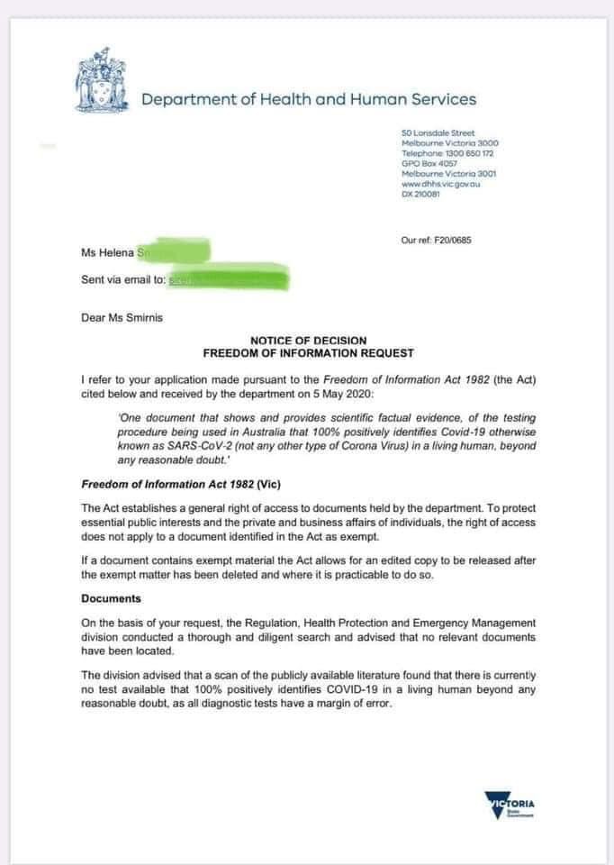 In Australia when the government was recently asked under the Freedom of Information Act to provide “a document that shows there is a test that 100% positively identifies the causal agent, SARSCov2, and not other coronaviruses” the government response was “no relevant documents have been located”.
