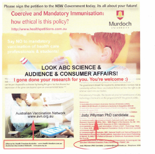 Rachael Dunlop has no publications in the history of infectious diseases or vaccination science or politics and she runs a blog (like many other Skeptic subscribers/members) that uses abuse and ridicule to present her arguments. It is titled “The Skeptics Book of Pooh Pooh”. In 2009 she defaced a poster that I presented to health professionals at the Australian Health Promotion Association (AHPA) Conference in Perth with false information and published it on her Skeptics blog. Please see the original poster and the defaced poster attached.